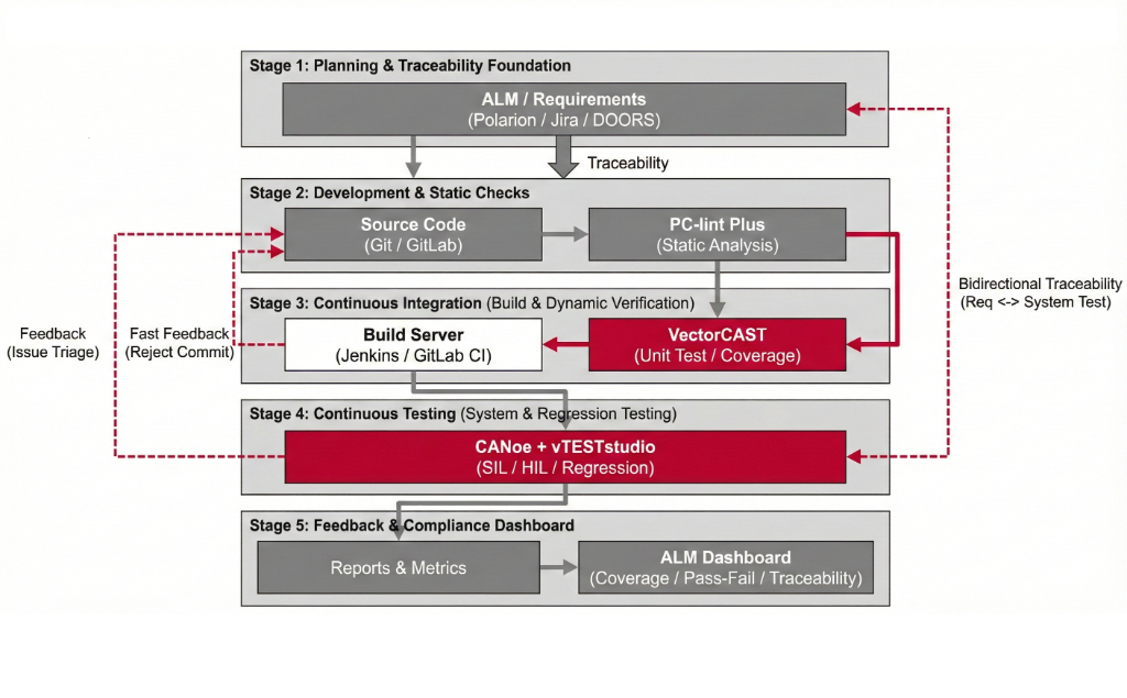 通過靜態檢查的程式碼會進入建置伺服器進行編譯。此時 VectorCAST 會自動執行單元測試並分析程式碼覆蓋率,確保新加入的功能不會破壞現有邏輯,並驗證模組層級的正確性。
