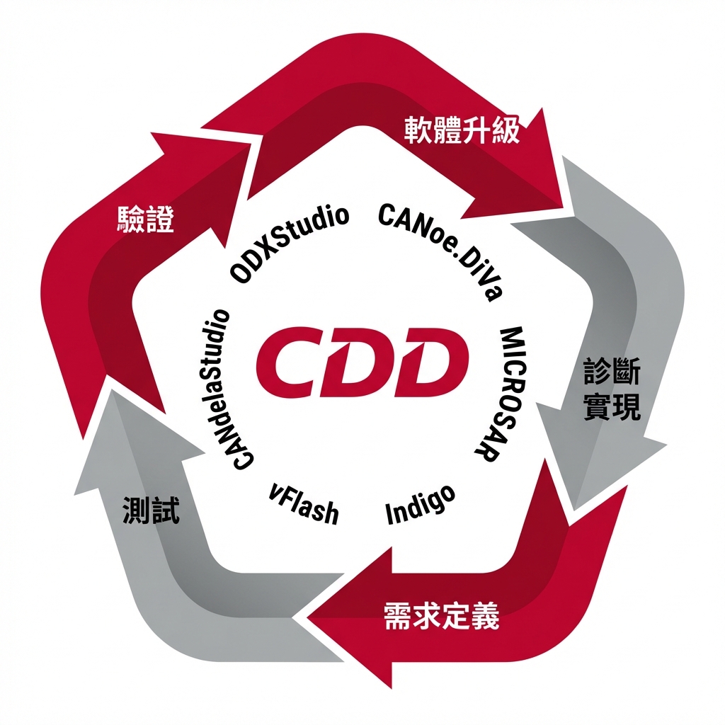 UDS 統一診斷服務是現代車輛電子控制單元 (ECU) 與外部診斷設備溝通的通用語言,亦即 ISO 14229 標準。而在歐特莫夫的解決方案中,「CDD」指的是 CANdela Diagnostic Data,它不僅是一個檔案格式,更是整個開發流程的大腦。 這套流程改變了傳統依賴 Word 或 Excel 管理診斷表的模式,將所有診斷參數、服務與時序要求數據化。透過以 CDD 為核心的開發模式,我們能讓設計端、實作端與測試端使用同一份數據語言,徹底解決了跨部門溝通時資訊不同步的痛點,特別適用於電動車 (EV) 與自駕車等電子架構複雜的領域。